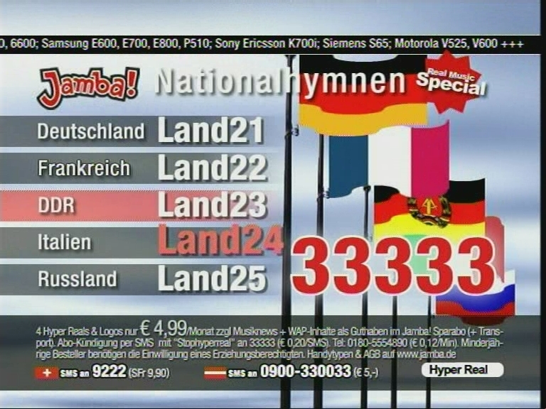 4 Hyper Reals & Logos nur € 4,99/Monat zzgl. Musiknews + WAP-Inhalte als Guthaben im Jamba! Sparabo (+ Transport). Abo-Kündigungen per SMS mit „Stophyperreal“ an 33333 (€ 0,20/SMS). Tel: 0180-5554890 (€ 0,12/Min). Minderjährige Besteller benötigen die Einwilligung eines Erziehungsberechtigten. Handytypen & AGB auf www.jamba.de
