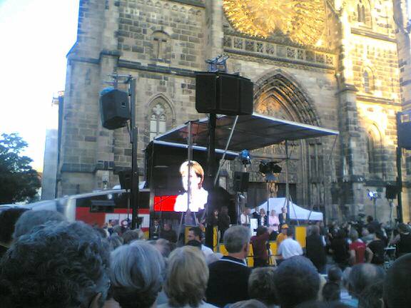 Und wie beim Stoiber gab es Sitzplätze für das hauptsächlich überalterte Publikum, die sehr viel Platz direkt vor der Bühne wegnahmen. Ich denke das war wohl auch eine kleine „Sicherheitsmaßnahme“ um Demonstranten in sicherer Entfernung zu wissen ;-) Der Platz war bis zum Zerreißen voll als die „zukünftige Bundeskanzlerin“ mit ihrem „Regierungsprogramm“ auftrat … nunja…