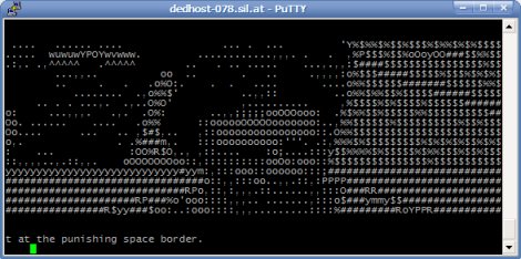 Für alle, die mit wenig Bandbreite und keinem Fernseher ausgestattet sind: die Weltmeisterschaft im ASCII-Format. Man ruft einfach eine Telnetadresse auf (Port 2006 muss nach draußen offen sein) und schon sieht man die WM im Textmodus, live! :-)