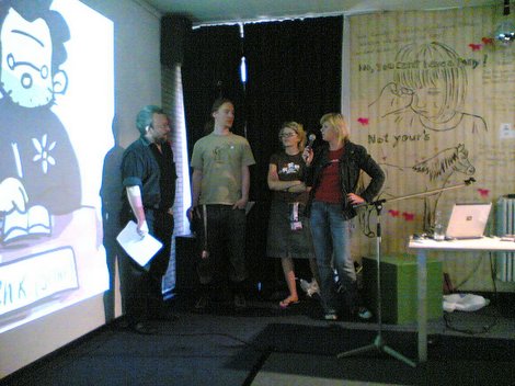 Am Abend fand dann noch die Toonblogger-Lesung von unserer berühmten Erlanger Bloggerin und anderen begabten Zeichner(inne)n statt. Und weil das Vorlesen von Comics/Cartoons nicht gar so spannend ist, gab es noch verschiedene „Battles“ zwischen den Cartoonisten. Lisa Neun hat davon die besseren Bilder und so erspare ich euch meine verrauschten Handyaufnahmen und zeige nur ein Foto der anwesenden Toonblogger.