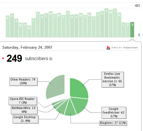 Mal sehen, ob die Zahl meiner Abonnenten nun auch weiterhin direkt mit der Zahl der Besucher auf der Webseite korreliert. Bisher war es nämlich so, dass Aufrufe des Feeds z.B. durch die Google Toolbar als Subskription angezeigt wurden. Deshalb schwankte die Zahl – zumindest bei mir – sehr. Wie sieht das auf euren Blogs aus?