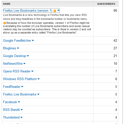 Dass dem nicht so ist, erklärt Feedburner bei der genauen Auflistung. Endlich werden die ganzen Firefoxzugriffe nicht mehr als Livebookmarks mitgezählt. Das hat jetzt fast ein halbes Jahr gedauert … wow …
