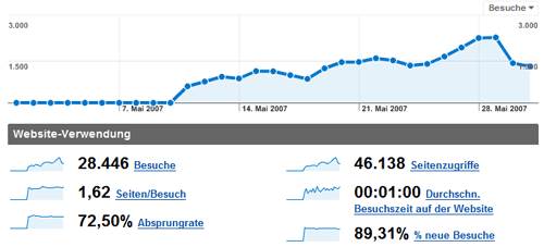 Das Bild zeigt Analytics, weil es hübsch aussieht, aber da fehlen leider die ersten 10 Tage. Insgesamt waren es im Mai knapp über 43000 Besucher bei 68000 Seitenaufrufen. Die meisten Besucher sind dabei neue Besucher, die über Google mein Blog bzw. einen Artikel (wahrscheinlich den über Youporn) gefunden haben. Nur etwa 10% der Besuche stammen von Stammlesern und von denen, die schon mal einen Kommentar abgegeben haben waren letzten Monat genau 59 (±2-3 paranoide Cookielöscher) auf dem Blog.