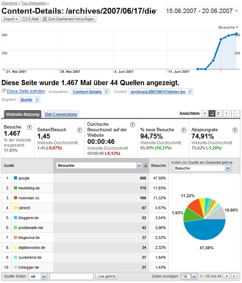 Für heute ist der Artikel schon der mit den meisten Besuchern, allerdings noch ohne Suchmaschinenbesucher. Die meisten kommen vom Heuteblog und die klicken dort offensichtlich verzweifelt auf alle Links, die sie finden können (und so auch den Pingback von hier).