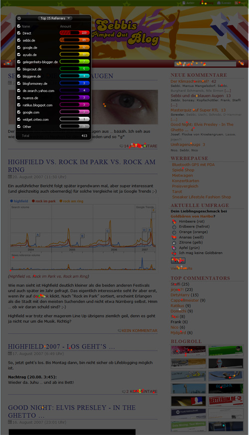 Das Bild stellt die normale Heatmap dar und es haben wohl sehr viele Besucher auf die Kommentarlinks, die Umfrage und auf die Links zu den weiteren Seiten unterhalb der Beiträge angeklickt. Die Confetti-Ansicht macht das ganze dann noch schön bunt.