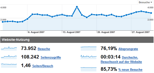 Jeden Monatsanfang wieder gibt’s die Blogstatistik, so auch im August. Ende Juli hatte ich ein paar Probleme mit Google, weil ich für meinen Namen nicht mehr in den Suchergebnissen aufgetaucht bin. Das hat sich nach 2 Wochen allerdings wieder erledigt und alles ist jetzt wieder in Ordnung. So kam es auch zu einer über 30%-igen Steigerung der Besuche (74000 insgesamt, 65000 Uniques), die immer noch zu ca. 80% aus Besuchern von Suchmaschinen bestehen. Die Seitenaufrufe (108000) sind nicht in dem Maß gestiegen, so dass insgesamt weniger Seiten pro Besucher angeschaut wurden. Blogs (oder mein Blog) scheinen immer noch schädlich für das Durchhaltevermögen von Websurfern zu sein ;-) … immerhin ist die Besuchszeit im Vergleich zum Vormonat leicht gestiegen.