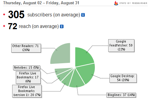 Meinen Artikelfeed haben laut Feedburner zur Zeit 345 Leser abonniert. Im Monatsdurchschnitt waren es 305 bei einer „Reach“ (Reichweite?) von 72. Insgesamt wurden meine Artikel 8828 mal (gar kein so kleiner Anteil) in einem Feedreader angezeigt, 1879 mal hat jemand auf die Überschrift geklickt und den Artikel dann auf meiner Webseite angeschaut.