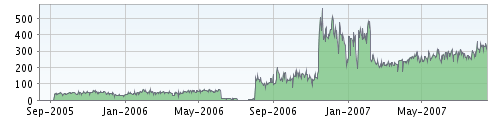 2005 bis Mitte 2006 war die Zahl eigentlich recht konstant. Dann habe ich den Dienst eine weile lang nicht mehr genutzt, aber konnte dann doch nicht den ausführlichen Statistiken widerstehen. Seit einem Jahr ist der Anstieg der Abonnenten – mit Ausnahme von ein paar Monaten in denen Feedburner falsch gezählt hat – eigentlich ziemlich linear verlaufen. Heißt also in einem Jahr bedanke ich mich hier bei 600 Feedlesern ;-)