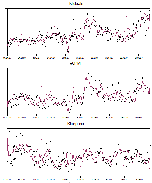 Google verbietet einem ja detailliert über Dinge wie die Klickrate, Klickpreise oder den Erlös pro 1000 Einblendungen (eCPM) zu berichten. Ich weiß nicht, ob auch das gegen die Terms of Service verstößt, aber ich habe aus meinen Daten des Jahres 2007 (bis jetzt) mal ein paar Diagramme geschnitzt. Ohne Skalierungsfaktor sollten daraus nur relative Änderungen abgelesen werden können und das ist hoffentlich erlaubt ;-)