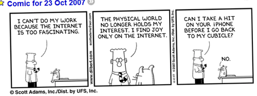 Dilbert trifft es schon immer ganz gut. Normalerweise schalte ich ja nach dem Aufstehen meist sofort den Computer an um Mails, etc zu lesen. Das iPhone verkürzt den Schritt auf einen Griff neben das Bett. Handies mit WLAN sind sehr bequem, besonders wenn sie ein großes Display haben :)