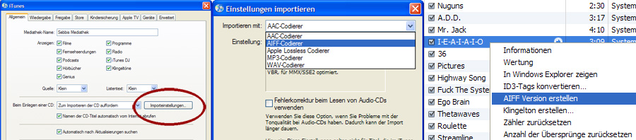 - Dort dann unter „Bearbeiten“->“Einstellungen“ im Tab „Allgemein“ den Knopf „Importeinstellungen…“ drücken und unter „Importieren mit:“ den AIFF-Codierer auswählen. Die andere Einstellung auf Automatisch belassen.