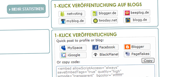Das Einbetten bereitet auch noch einige Probleme, denn der Code der Flashmethode enthält Zeilenumbrüche, die sich nicht gut mit WordPress vertragen. Der Code für die Widgets benutzt keine normalen doppelten Anführungszeichen sondern die einfachen und das funktioniert ebenfalls nicht mit WordPress. Hat man das aber nachträglich selbst korrigiert klappt es allerdings wunderbar.