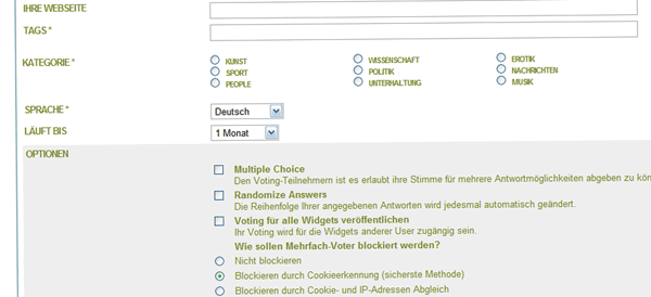 Und noch etwas interessantes: zusätzlich zur direkten Einbindung einzelner Umfragen kann man auch mehrere Umfragen in einem so genannten Widget zusammenfassen und einbinden, die dann scheinbar nach dem Zufallsprinzip angezeigt werden.