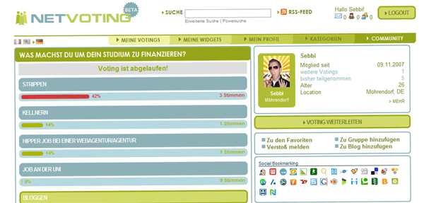 Sonst lässt sich eigentlich nur anmerken, dass es mehr Kategorien für die Umfragen geben könnte. Der Dienst bietet übrigens die grundlegenden Features von Web 2.0 Anwendungen bzw. sozialen Netzwerken (Gruppen, Freundeslisten, Favoriten, Rankings), aber ich denke der Hauptnutzen von Netvoting besteht für die meisten letztendlich wohl nur im einfachen Erstellen und Einbinden von eigenen Umfragen, nicht in den social features. Ich könnte mir sehr gut vorstellen, dass man bald öfters solche Umfragen auf MySpace & Co (der Dienst ist international in Deutsch, Englisch und Französisch benutzbar) zu sehen bekommt :twisted: