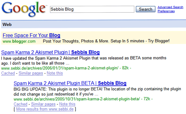 Hmm … ich habe gerade aus Versehen bei google.com statt .de nach meinem Blog gesucht. Wie ihr vielleicht wisst hat mein Blog seit einiger Zeit einen Pagerank von 0 verpasst bekommen und wie es scheint, spiegelt sich das zumindest im Amerikanischen Index wieder. Denn sucht man nach dem Namen meines Blogs kommt zwar das richtige Ergebnis, aber angezeigt wird ein Artikel, der noch Pagerank hat und nicht die Hauptseite.