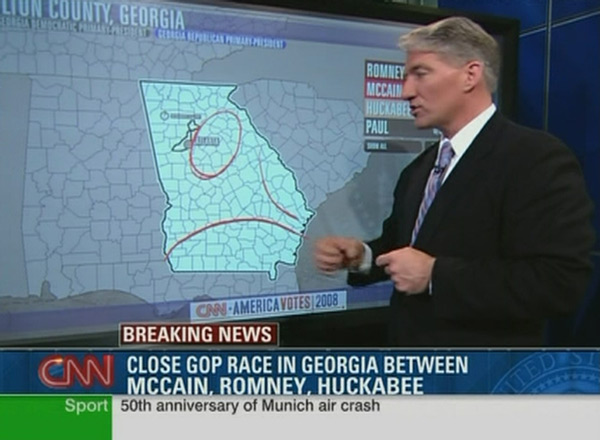 Mal abgesehen von diesem seltsamen „Situation Room“ von Wolfi mit seinen vielen Bildschirmen, denen man einfach nicht folgen kann, scheint CNN wirklich alles neue auszuprobieren, oder? So haben sie eine unglaublich aufwendige Multi Touch Anwendung um die Stimmen darzustellen. Wow! Fast ein bisschen Minority Report ;-)
