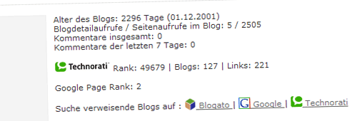 Beim Testen von Blogoscoop – soll die Blogosphäre in Zahlen erfassen, macht momentan auch scheinbar nicht viel mehr als bekannte Schwanzvergleicher vorher – fiel mir auf, dass dort Pagerank 2 für mein Blog steht. Google Toolbar herausgekramt und tatsächlich … 2! Und das trotz immer noch vorhandener Textlinkanzeigen in der Seitenleiste. Naja, was mache ich nun mit dem grünen Balken? Nüscht, richtig ;-)