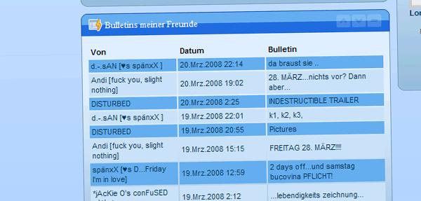 Wer von euch MySpace benutzt kennt bestimmt auch die Bulletins dort. Man schreibt damit quasi eine öffentliche Nachricht, die alle Freunde automatisch in einer Liste sehen können (siehe Bild oben). Wenn man dann auf so eine Nachricht klickt bekommt man nun unter der Nachricht zwei Knöpfe angezeigt …