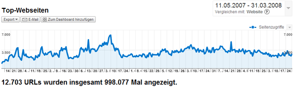Die Besucherzahlen sind auch im März merklich zurückgegangen und so waren insgesamt nur 49700 Besucher insgesamt 55500 mal hier und haben dabei 81200 Seiten angeschaut, ein Minus von 17-19%. Wo die Besucher ausgeblieben sind ist recht schnell identifiziert, denn meine beiden stärksten Artikel – wenn man nur die Besucherzahlen betrachtet – haben um 40% (Youporn/Pornotube) bzw. 30% (2 Girls 1 Cup) nachgelassen. Aber auch die Startseite meines Blogs hat um 3,5% nachgelassen (nur noch 4500 Aufrufe), war in den letzten Tagen aber sehr viel höher als im Durchschnitt. Insgesamt bekomme ich aber scheinbar schon seit Monaten nicht mehr Besucher auf meine Startseite/Blog. Das gibt zu denken.