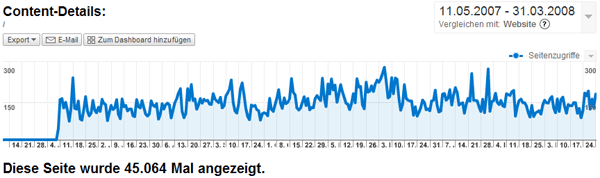 Meine Technorati Authority ist von 131 auf 128 gefallen, die Zahl der Feedleser ist auf aktuell 377 gestiegen (waren im März auch schon mal über 400). Bei den aktiven Stammlesern hat sich nichts verändert … sehr zuverlässig kamen auch diesen Monat rund 100 Besucher auf mein Blog, die schon mal einen Kommentar hinterlassen haben. Vielen Dank!