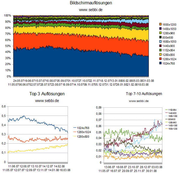 Letztes mal habe ich ein wenig etwas über die Betriebssysteme meiner Besucher (nicht sehr spannend) geschrieben. Dieses mal geht es um die Bildschirmauflösungen und zwar über den Zeitraum Mai 2007 bis heute.