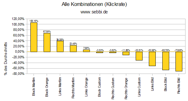 Insgesamt sieht die Verteilung der Klicks wie oben aus. „Block Maritim“ gewinnt haushoch vor „Block Orange“, „Links Maritim“ und „Rechts Maritim“. Der Rest ist Durchschnitt oder extrem schlecht (Bildanzeigen) was die Klickrate angeht.