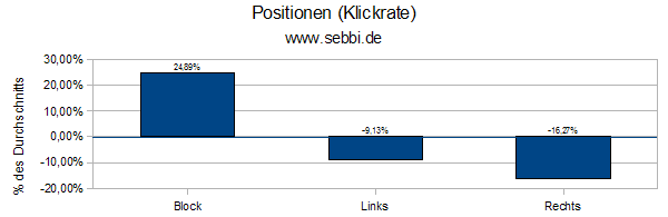 Bei den Positionen gibt es einen klaren Sieger. Die Anzeigen ohne umfließenden Text („Block“) hatten im Testzeitraum eine knapp 25% höhere Klickrate als der Durchschnitt, die beiden Anzeigen mit umfließenden Text performten eher unterdurchschnittlich.