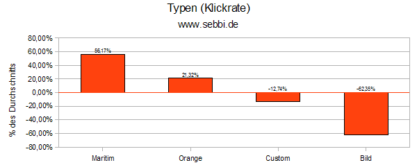 Auch bei den Typen gibt es klare Verteilungen. Am meisten Klicks bekamen die Anzeigen im Maritim-Design (Google Standard), es folgen die orangen Links und am schlechtesten schneiden die Bildanzeigen ab (deutlich).
