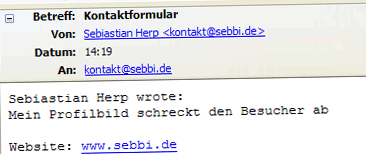 Wirklich? Ich bekomme ja öfter über das Kontaktformular fragwürdige Mails zugesendet, aber nicht viel trifft mich so hart wie eine Beleidigung meines mühevoll gepimpten Profilbildes (das ich so überall verwende … Twitter, ICQ, Myspace, etc). Pah!