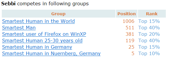 Bereits 13 Teilnehmer und wir (Link zur Gruppe) sind auf Platz 51! Yeah! Ich bin gespannt wie sich die IQ-Werte entwickeln, wenn die Seite bekannter wird …