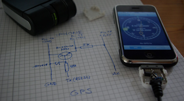 Ich hab auch mit GPSd und iGPSD experimentiert … beide Programme funktionieren, haben mich aber irgendwie nicht überzeugt. Hardware war auch kein Problem. Simba schreibt auf seinem Blog zwar etwas von Holux GPS Mäusen, die scheinbar ihr Signal schon für’s iPhone passend (TTL Pegel) ausgeben, aber mit einer simplen Pegelwandler-Schaltung (ich bin so stolz auf mich!) kommt man auch von RS232 auf TTL runter (siehe Bild) und es passt auch noch alles in den Stecker rein.