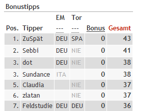 Es sieht wohl so aus als ob Flo alias ZuSpät schon relativ sicher gewonnen hat. Ich kann ihn durch normale Tipps zwar noch überholen, aber meine Platzierung zählt für den Gewinn ja nicht. Alles was ihn noch zu Fall bringen kann sind die Bonuspunkte, aber halt … auch da tippen alle gleich und durch den Spanientipp beim Torschützenkönig, der momentan sogar richtig ist, kann er auch nochmal 5 Punkte dazubekommen.