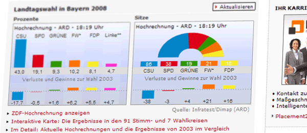 Wie von den meisten vorhergesehen verliert die CSU in Bayern deutlich Stimmen. Fast 18 Prozentpunkte weniger … tja, Beckstein/Huber (und Söder) sind halt keine Stoibers :/