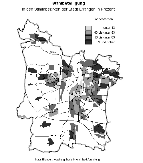 Unter 43% Wahlbeteiligung gab es in folgenden Stimmbezirken laut Erlangen.de: