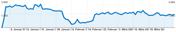 Wie man erkennen kann, gab im Februar einen großen Einknick. Der Grund war ein Hack auf meine WordPressinstallation und einige hundert Spamlinks, die so unsichtbar in meinem Footer gelandet sind. Mein Blog wurde daraufhin für die meisten Suchbegriffe ziemlich weit hinten aufgelistet … nach Entfernen des Schadskriptes und ein paar Tagen Warten, war alles wieder halbwegs ok. Auf das Niveau von vorher ist die Zahl der Suchmaschinen aber nicht mehr angestiegen.
