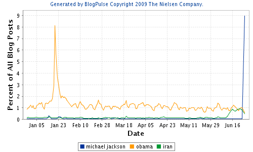 … mich eingeschlossen. Nach seinem Tod, geht ein Raunen durch die Welt (heise.de beschreibt es ganz schön). Und das schon gestern verlinkte BlogPulse Diagramm schoss mittlerweile in die Höhe … fast 10% der Blogosphäre beschäftigt sich mit MJ. Selbst Obama bekam nicht so viel Aufmerksamkeit bei seiner Amteinführung ab.