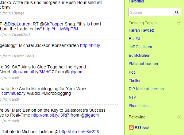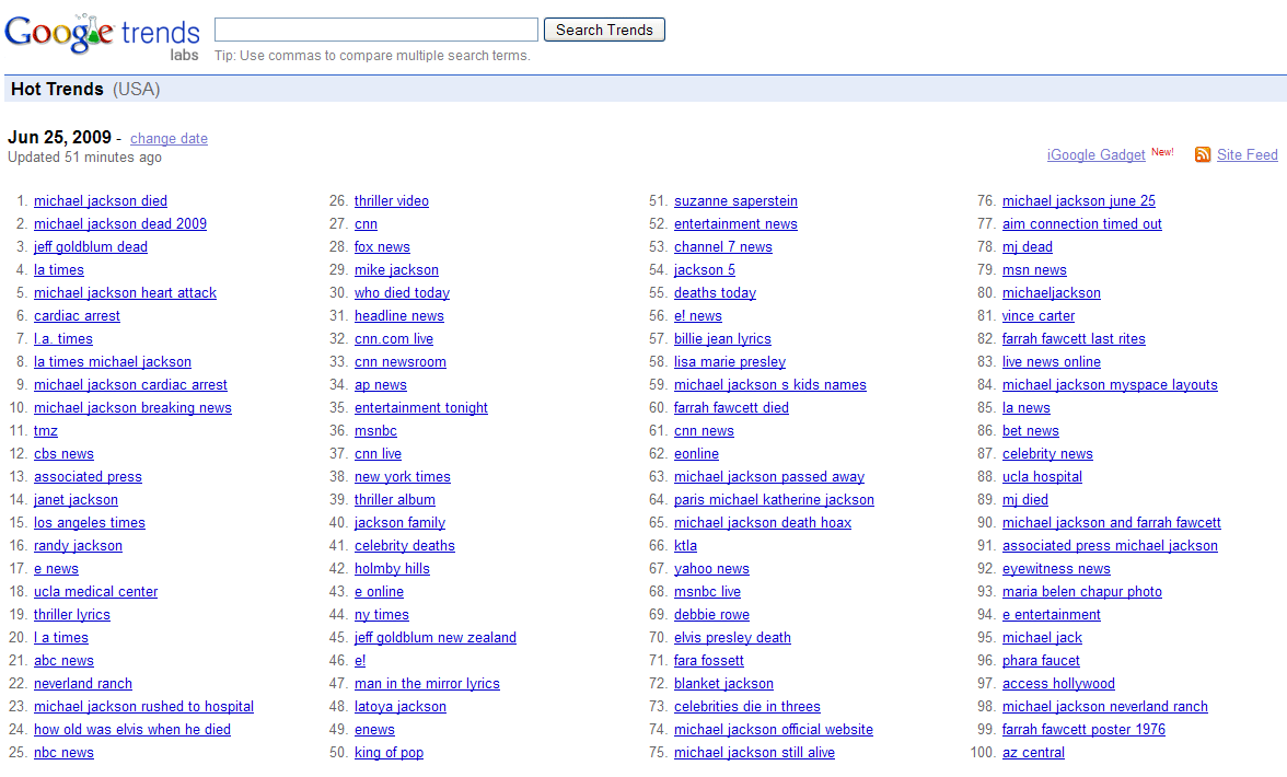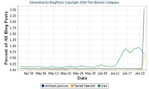 Einfach nur krass. Farrah Fawcett. bekannt aus „Drei Engel für Charlie“ ist übrigens auch gestorben. Außerdem hält sich hartnäckig das Gerücht Jeff Goldblum sei von einem Gerüst gefallen und dabei auch draufgegangen. Deshalb die beiden Namen ebenfalls in den Trendcharts. Der Iran als Thema wird nun also von Michael Jackson vertrieben … wer hätte das gedacht?