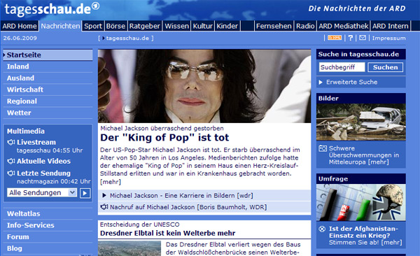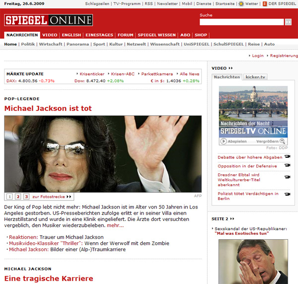Michael Jackson scheint also an einem Herzinfarkt im Alter von 50 Jahren gestorben zu sein. Gerade plante er eine Art Comeback, deshalb wird bei vielen Nachrichten über ihn wohl noch Werbung für Konzertkarten angezeigt werden … nunja … man kann von ihm halten was man will, aber jeder Mensch auf diesem Planet kennt ihn, zumindest die mit Internetanschluss und so sorgt dieses Thema für einigen Wirbel (und Webseiten, die nicht mehr funktionieren, z.B. Youtube, teilweise Twitter und diverse englischsprachige Newsseiten) …
