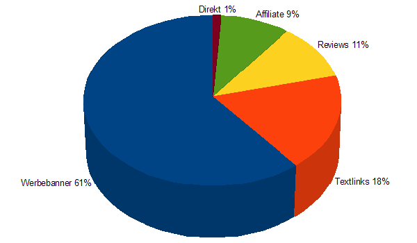 Im nächsten Diagramm sieht man auf welche Kategorien sich die Werbeeinnahmen aufteilen. Den größten Teil machten Werbebanner wie Adsense aus, gefolgt von Textlinks und Reviews. Affiliatelinks (Hauptsächlich Amazon) funktionierten eine Zeit lang – ein Artikel über einen Amazongutschein war ziemlich prominent in den Suchergebnissen bei Google platziert – auch super.