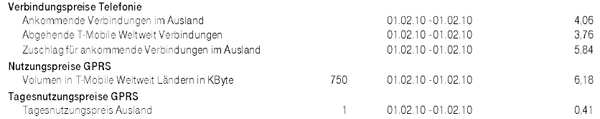 Lasst euch das eine Lehre sein, wenn ich das nächste Mal ins nicht-europäische Ausland fahrt/fliegt. Am 1. Februar war ich nämlich noch bis Nachmittag in den USA und nur für diesen einen Tag mit einmal kurz im Web was nachschlagen und zwei kurzen Gesprächen nimmt T-Mobile – obwohl über ihre amerikanische Schwester verbunden – ganze 20 Euro ohne Mehrwertsteuer.