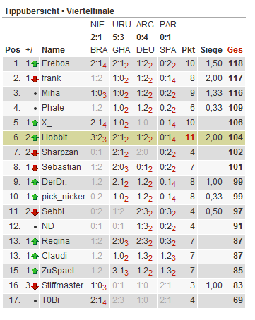 Beim Tippspiel führt momentan Erebos knapp vor dem bisherigen Ersten Frank. Die Runde gewonnen hat die Hobbitdame …