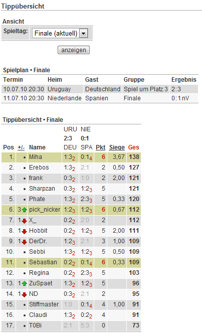 Beim diesjährigen WM-Tippspiel hat nach einem spannenden Endspurt Miha vor Erebos, frank, Sharpzan und Phate gewonnen. Entscheidend waren am Ende die Antworten auf die Bonusfragen und der korrekte Siegtipp von 1:0 für Spanien. Das gab nochmal 12 Punkte und somit den verdienten Gewinn ;-) Herzlichen Glückwunsch und viel Spaß mit dem Amazongutschein!