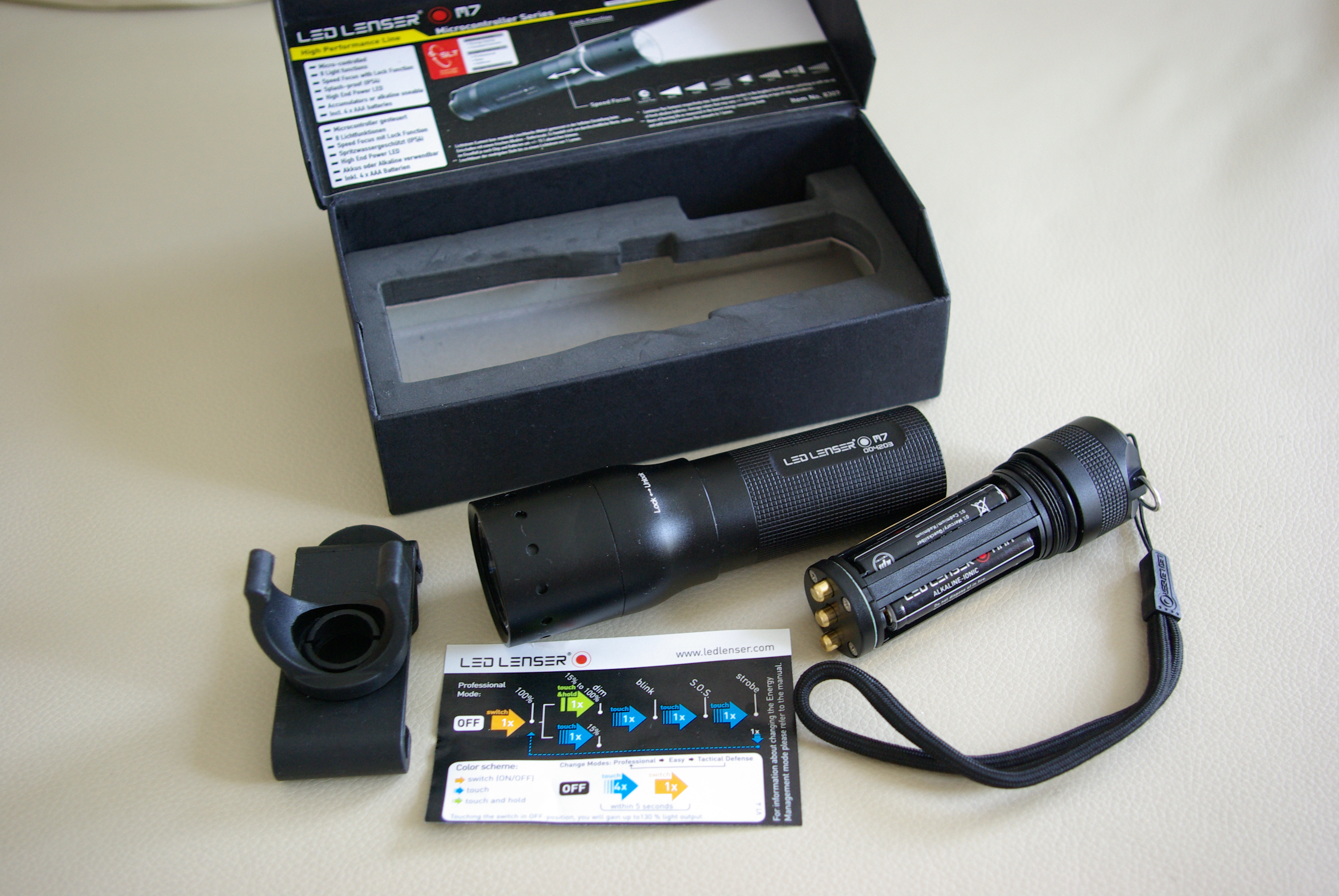 Geliefert wird die Taschenlampe (siehe Galerie unten) mit einer sogenannten Smart Card auf der alle Funktionen kurz beschrieben sind, einem Gürtelclip, der die Lampe etwas fest an sich klammert, einem Band für’s Armgelenk und natürlich mit einer ausführlicheren Anleitung und Batterien. In die M7 passen dabei 4 AAA Batterien und – das ist meines Wissens neu – auch Akkus können verwendet werden. Laut Datenblatt soll man mit 4 frischen Batterien um 11 Stunden Licht auf der hellsten Stufe bekommen. Sehr ordentlich.