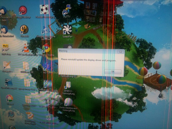 Etwas unerwartet hat sich meine Grafikkarte (Nvidia 8800 GTS) verabschiedet – ich vermute der DAC ist futsch, denn Bildschirmfotos enthalten diese Schlieren nicht – und jetzt habe ich meine alte 6600-er drin, die auch seltsame Bildstörungen produziert, die nur auf dem Monitor sichtbar sind. Allerdings nur im 3D-Modus, also geht es erstmal.