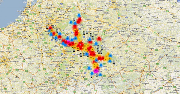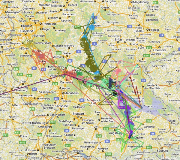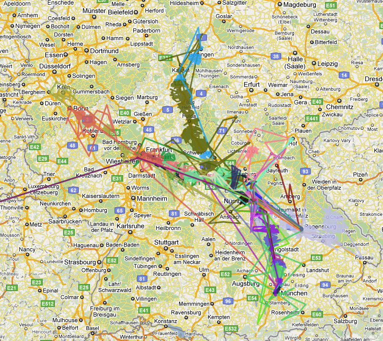 P.P.S.: Bonusbild ohne Marker, dafür alle Messpunkte mit Linien verbunden. Gleicher Tag, gleiche Farbe. Man sieht die Erfassung geschieht immer in Brocken, die sehr eng zusammenliegen (ähnliche Aufteilung der Farben, wenn man jeder Stunde eine eigene gibt).