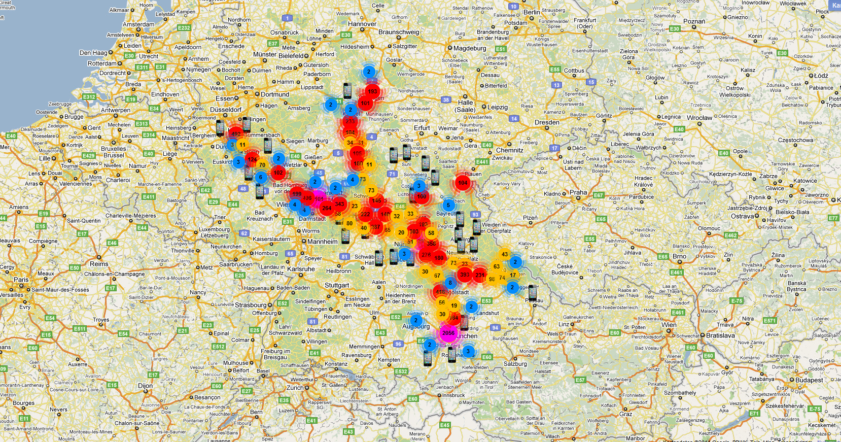 Beeindruckend viele Mobilfunkmasten befanden sich in der Logdatei meines iPhones, über 13000 Stück (Zeitraum ca. Ende August 2010 bis jetzt). Die Genauigkeit der Ortungen lässt zum Teil sehr zu wünschen übrig bzw. es ist schon beeindruckend mit was für Mobilfunkmasten so ein Handy alles Kontakt aufnimmt während man auf einer Autobahn entlang fährt.