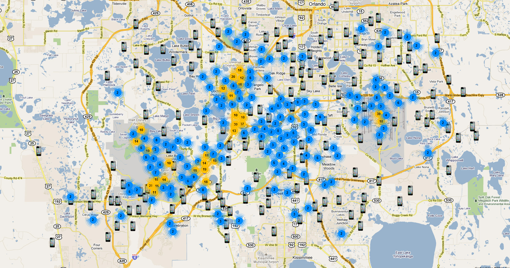 In großen Städten, in denen man sich längere Zeit aufgehalten hat, korrelieren die Mobilmasten bzw. deren Dichte allerdings stark mit den bevorzugten Aufenthaltsorten. Beispiel Orlando: