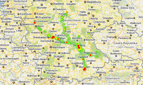 Awesome! Als Heatmap dargestellt könnte man schon eher sehen wo ich mich oft aufhalte. Dort wo man nicht in Bewegung war, ist die Dichte der erfassten Mobilfunkmasten sehr viel höher und das sieht man. Aber auch wenn man eine Stadt nur passiert (ich war in dem Zeitraum nie in Regensburg, sondern bin nur zum Skifahren dran vorbeigefahren) wird schon recht viel erfasst und führt neben den Städten in denen man eigentlich nicht war zu vielen Irrlichtern.