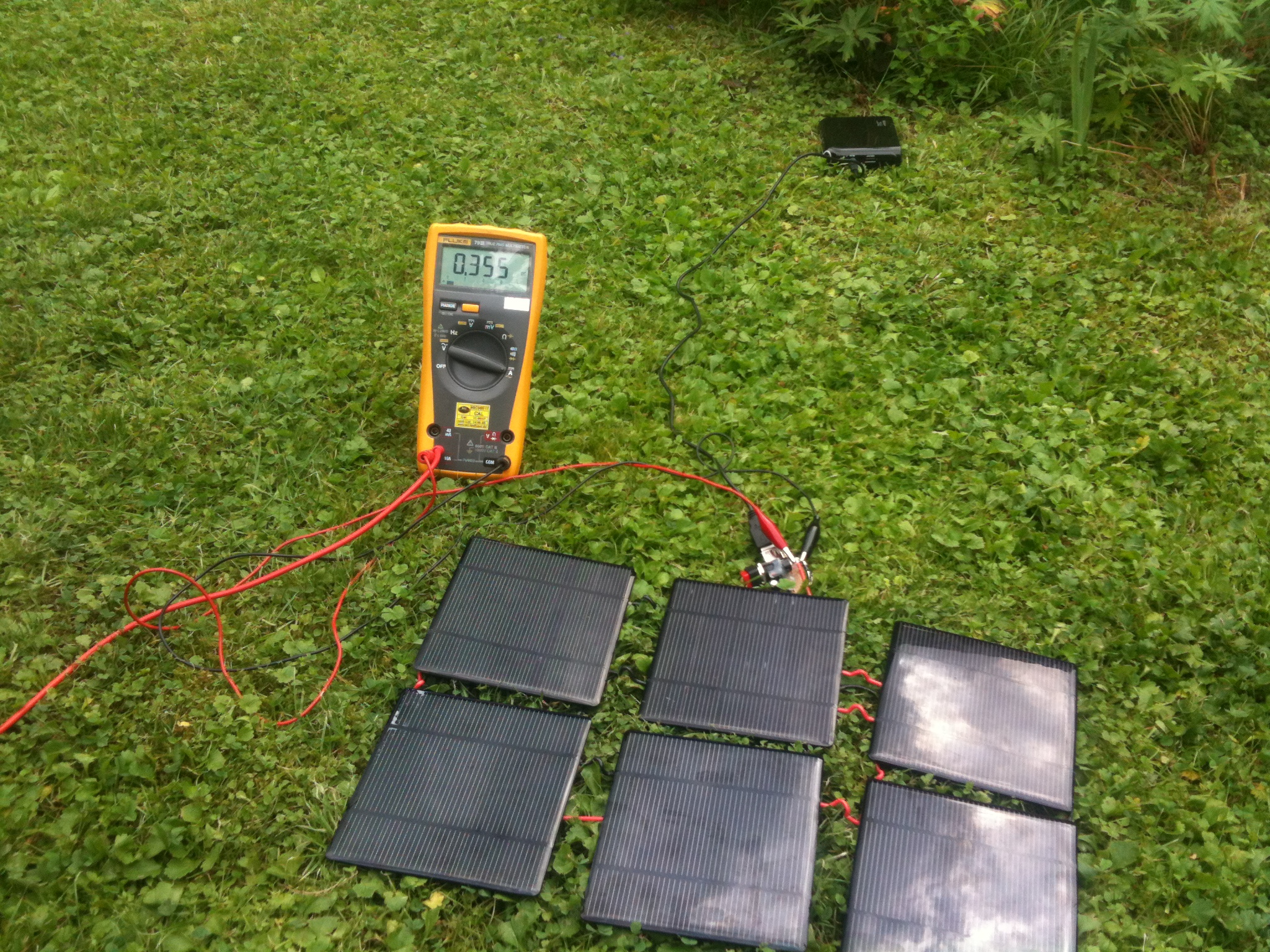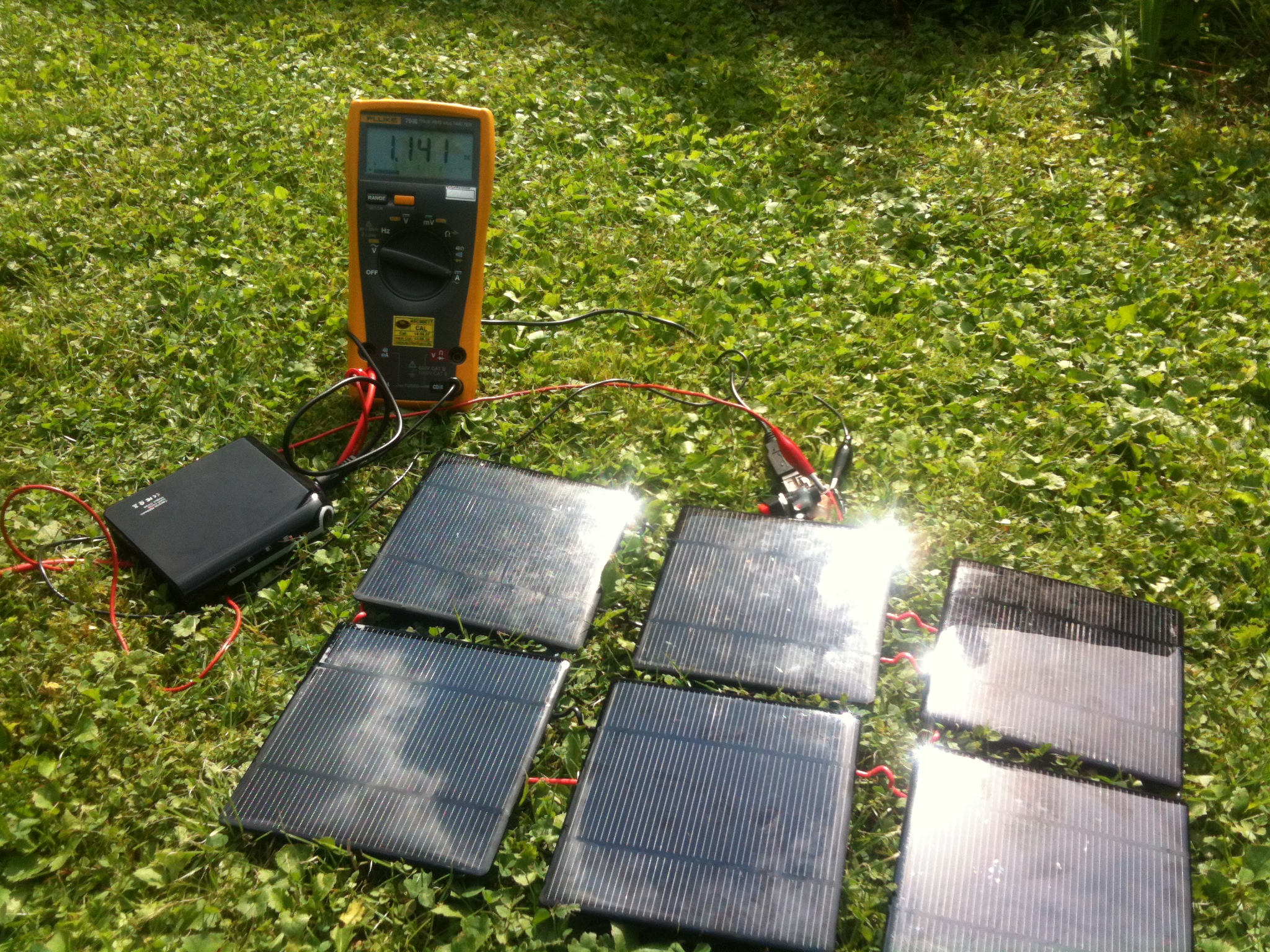 Vor zwei Wochen habe ich von meinem DIY Solarladegerät palavert und gestern kamen noch mal ein paar Chinazellen bei mir an. Jetzt sind es also 6 Stück und sollten nach Adam Riese die doppelte Menge Strom produzieren. Leider klappt das nur bei wirklich praller Sonne und mit perfekter Ausrichtung und das ist momentan gerade Mangelware. 1400 mA habe ich heute maximal auf dem Amperemeter mit Last ablesen können, der Kurzschlussstrom ist natürlich viel höher. Nicht schlecht ;-)