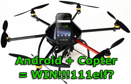 Etwas ähnliches haben übrigens zwei Österreicher schon probiert. Steuerung eines Bausets von Mikrokopter (die teuren Dinger von oben) mittels Bluetooth von einem Androidgerät aus. Das geht so weit, dass man dieses Androidhandy dann mit dem Mikrocopter mitfliegen lassen kann und ihm über das Internet Steuersignale schicken kann. In etwa so habe ich mir das vorgestellt, nur ohne die unnötige Steuerelektronik im Mikrocopter selbst …